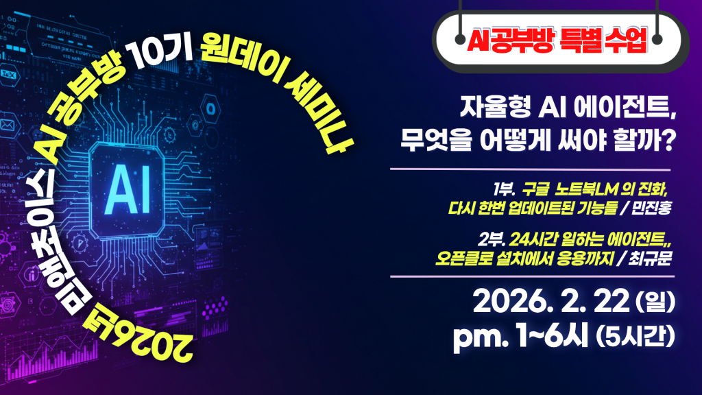 이같이 급변하는 시기에 [민앤초이스 AI 공부방]에서는 10기 중간 원데이 세미나 시간을 마련하고 다시 한번 추가 업데이트를 통해 슬라이드 편집 및 동영상 제작 기능까지 완성해나가고 있는 노트북엘엠의 최신 기능을 익히고, 개인 에이전트 비서로 급속히 확산중인 오픈클로로 직접 내 로컬 PC에 설치하고 일을 시켜볼 수 있게 하는 내용으로 원데이 세미나를 개최합니다.